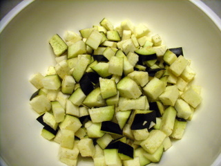 - Wash and cut eggplant into 1cm cubes ;