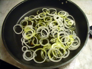 - mettere 2 cucchiai di olio nella padella (sempre la stessa) e fare soffriggere la cipolla per 5 minuti a fuoco lento.